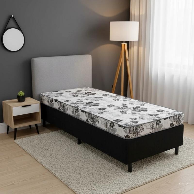 Box Solt. Sued Preto + Colchão Solt. Soffie Lotus 88x188x49 D20 – Nosso Sonho | Suporta até 80kg